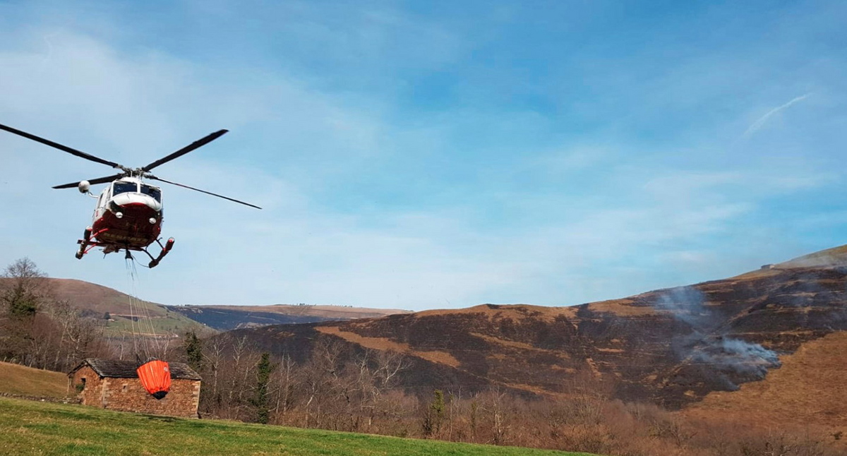 epa07378191 A handout picture made available by Cantabria's regional Government shows a helicopter fighting one of 50 active forest fires in Spain, 17 February 2019 (issued 18 February 2019). A total of 38 forest fires remain active 18 February 2019, after days fighting against different fires throughout the region. Since the forest fire alert was called on 14 February, a total of 194 fires have been registered. According to Authorities, most of the fires were caused by arsonists. EPA/CANTABRIA REGIONAL GOVERNMENT HANDOUT BEST QUALITY AVAILABLE HANDOUT EDITORIAL USE ONLY/NO SALES