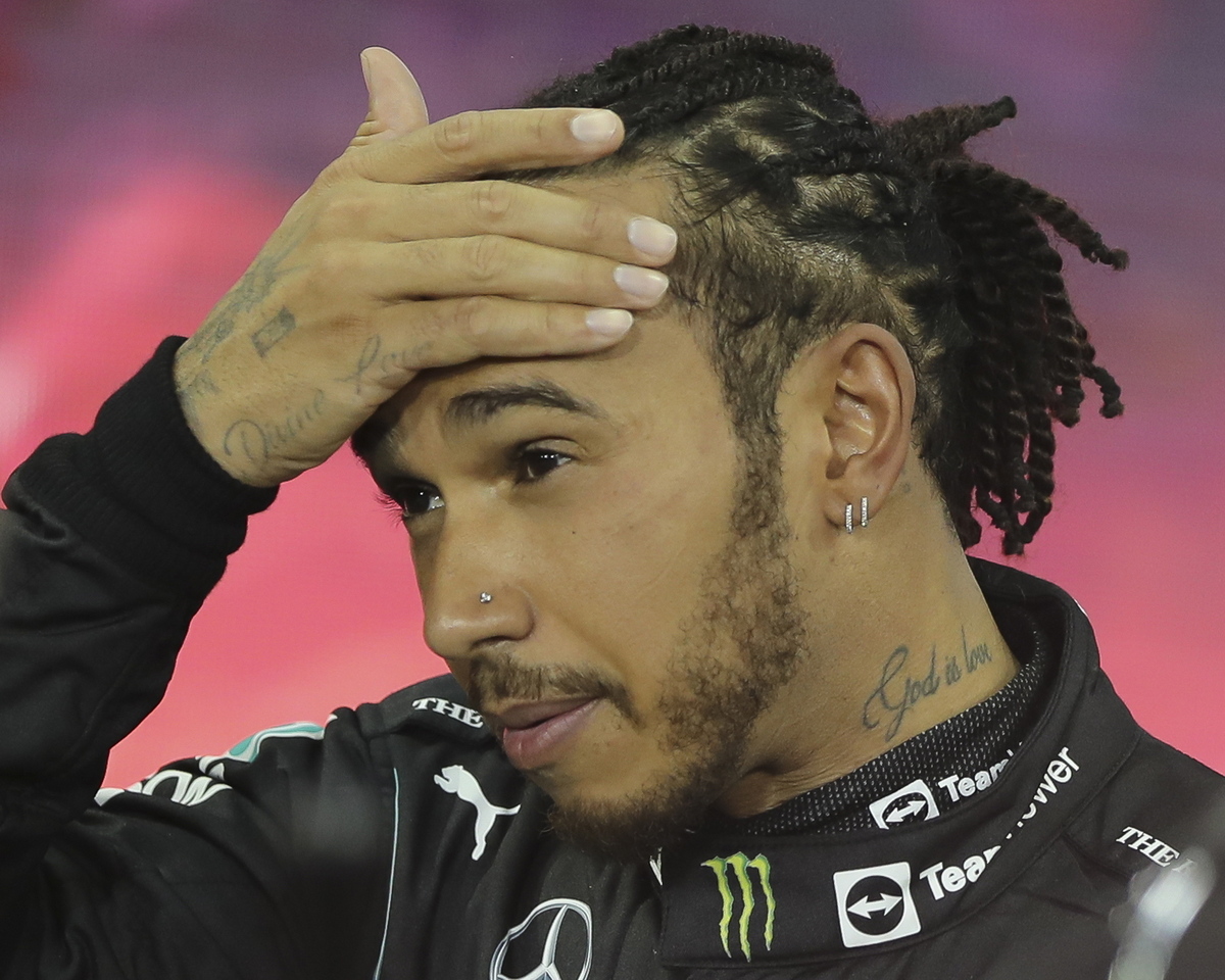 epa09638588 British Formula One driver Lewis Hamilton of Mercedes-AMG Petronas reacts after the 2021 Formula One Grand Prix of Abu Dhabi at Yas Marina Circuit in Abu Dhabi, United Arab Emirates, 12 December 2021. EPA/KAMRAN JEBREILI / POOL