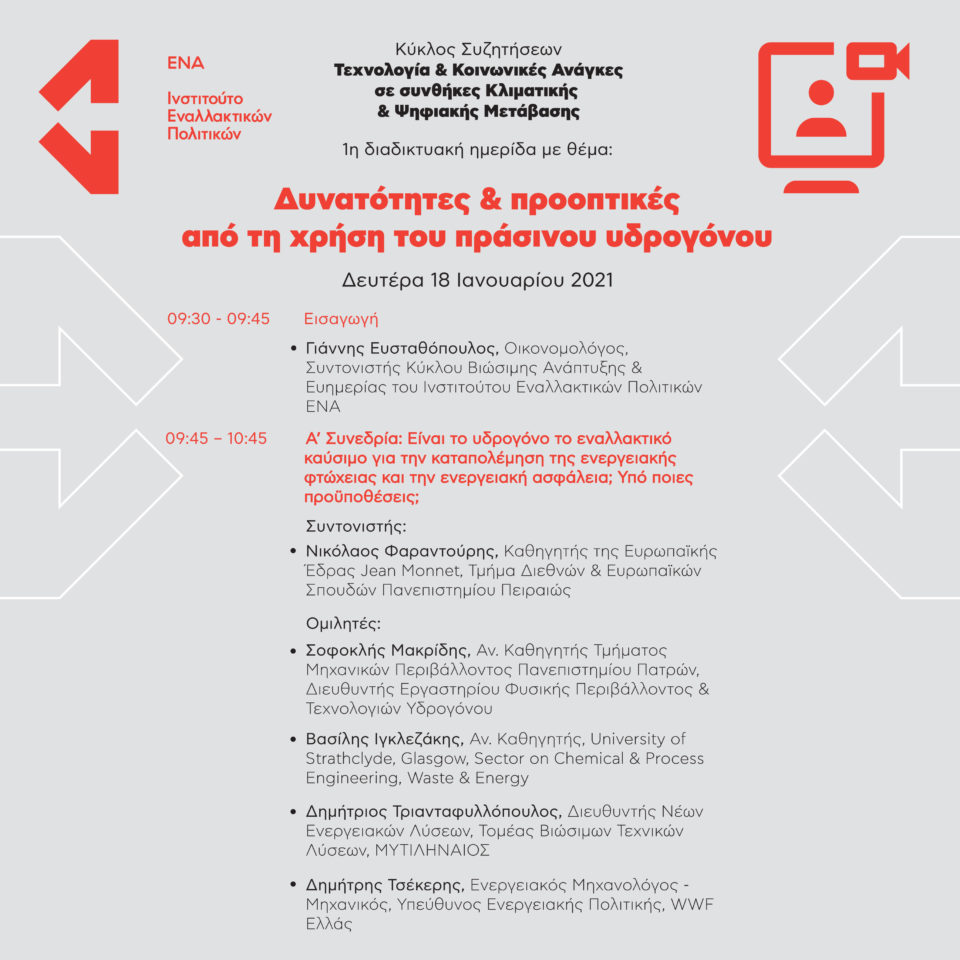 Με την ενημερωτική ημερίδα για ένα τεχνολογικό θέμα αιχμής όπως αυτό του υδρογόνου, το Ινστιτούτο Εναλλακτικών Πολιτικών ΕΝΑ εγκαινιάζει ένα νέο κύκλο συζητήσεων με θέμα «Τεχνολογία & Κοινωνικές Ανάγκες σε συνθήκες Κλιματικής & Ψηφιακής Μετάβασης» με στόχο το άνοιγμα της συζήτησης για την ενέργεια και το περιβάλλον στους πολίτες και τους κοινωνικούς φορείς. Στόχος της πρώτης αυτής ημερίδας είναι η ενημέρωση του κοινού για το θέμα του υδρογόνου, τις τεχνολογικές εξελίξεις και τις προοπτικές για την Ελλάδα.