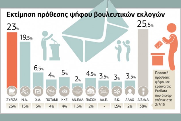Ενισχύονται τα σενάρια για συγκυβέρνηση μετά την πρώτη πανελλαδική δημοσκόπηση που έκανε η ProRata για την «Εφημερίδα των Συντακτών». Σύμφωνα με αυτή, το μεγαλύτερο ποσοστό των πολιτών (25,5%) δεν έχει αποφασίσει ακόμα τι θα ψηφίσει. Ακολουθεί ο ΣΥΡΙΖΑ με 23% και η Νέα Δημοκρατία με 19,5%.