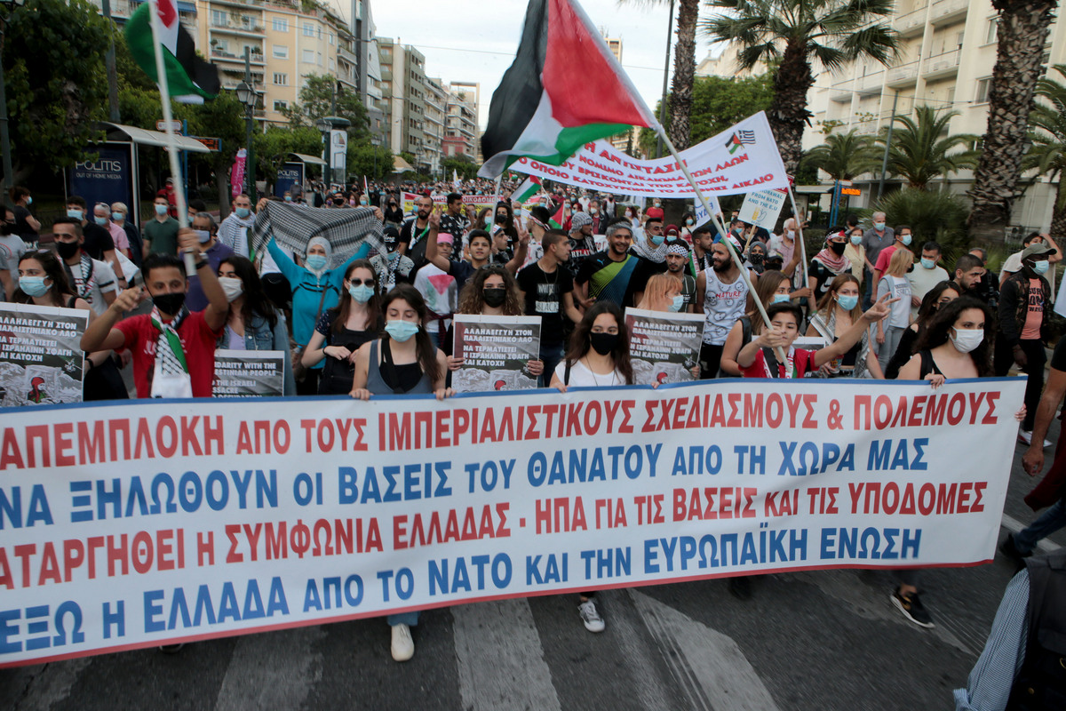 Κόσμος συμμετέχει σε πορεία της ΕΕΔΥΕ, στο πλαίσιο της οργάνωσης πρωτοβουλιών αντιιμπεριαλιστικής δράσης στο Υπουργείο Άμυνας , Κυριακή 16 Μαΐου 2021. Συγκέντρωση διοργάνωσε στο Υπουργείο 'Άμυνας η ΕΕΔΥΕ και στην συνέχεια πορεία προς την ισραηλινή πρεσβεία και κατάληξη στην αμερικάνικη πρεσβεία. ΑΠΕ-ΜΠΕ / ΑΠΕ-ΜΠΕ / Παντελής Σαίτας