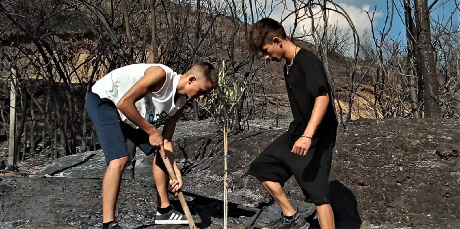 Πρόκειται για μια φωτογραφία που απεικονίζει δύο 15χρονα αγόρια, τον Βασίλη Παπαϊωάννου και τον Γιώργο Γαλάννη, που φυτεύουν συμβολικά το πρώτο δέντρο, μια ελιά, στον καμένο λόφο Γαλανή.