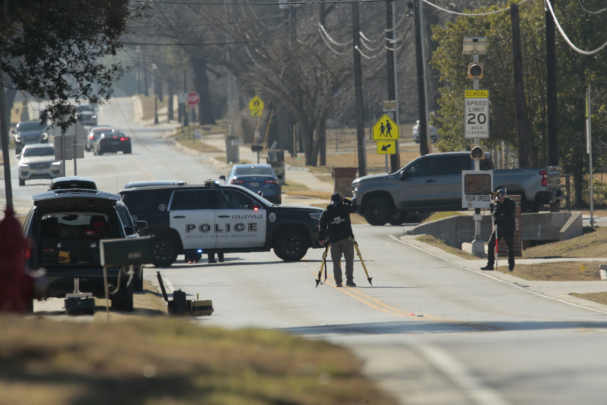 epa09689875 Law enforcement personnel continue the investigation to the hostage incident at Congregation Beth Israel Synagogue in Colleyville, Texas, USA, 16 January 2022. Four hostages were held by a gunman for ten hours in Congregation Beth Israel Synagogue on 15 January 2022 before the gunman was killed. The gunman was later identified as Malik Faisal Akram, a British citizen. EPA/RALPH LAUER
