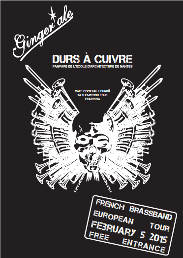 Οι Durs à Cuivre έρχονται από τη σχολή Αρχιτεκτονικής της Ναντ στη Γαλλία, στην Αθήνα για να μας κάνουν να χορέψουμε σε ρυθμούς που μπλέκουν το ποπ ροκ, τη ντίσκο και τη βαλκανική μουσική. Με τρομπέτες, τρομπόνια και κλαρινέτα, θα βρίσκονται στις 5/2 στο Ginger Ale της Πλατείας Εξαρχείων. Με είσοδο ελεύθερη.