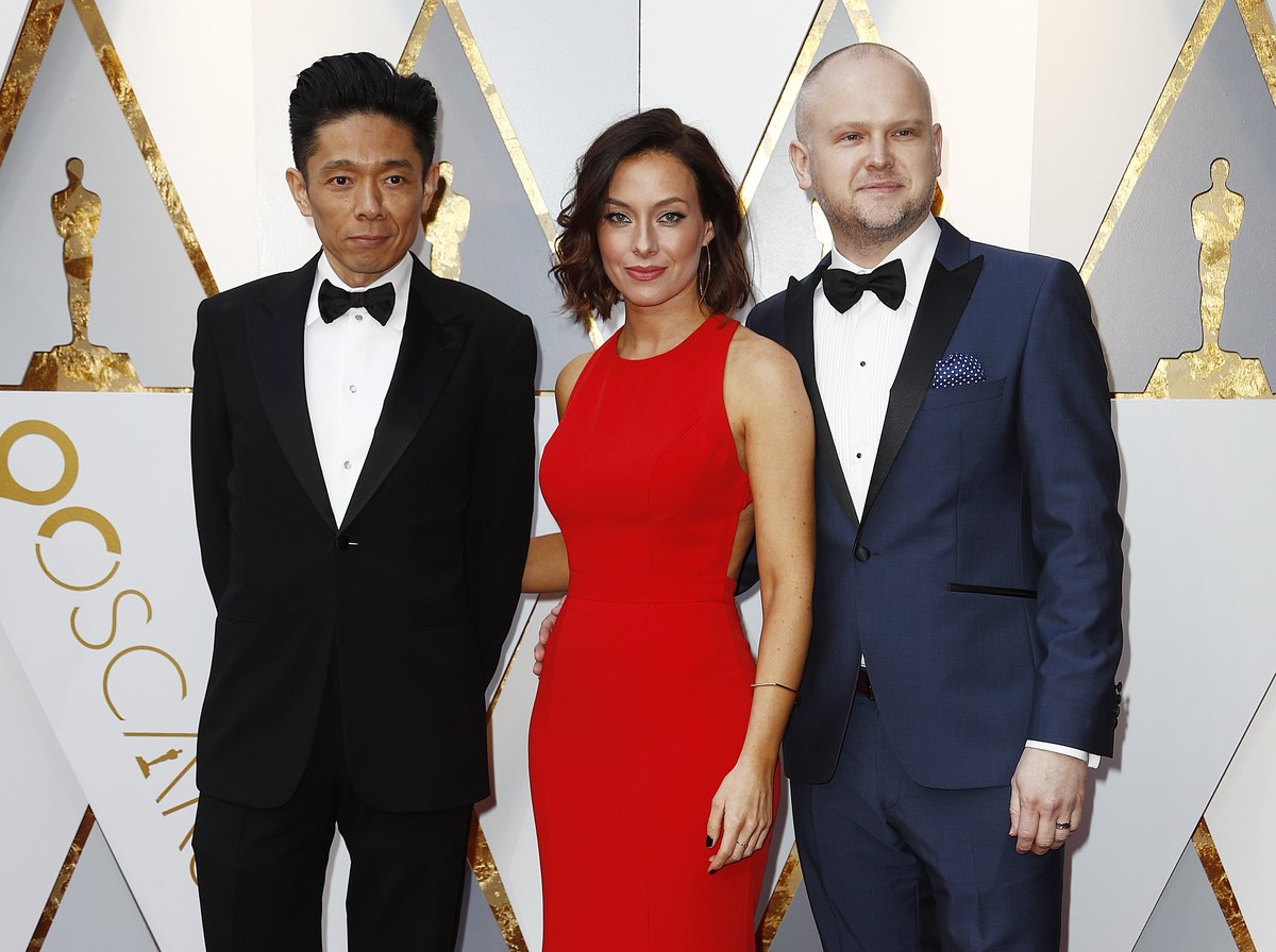 epa06580166 (L-R) Kazuhiro Tsuji, Lucy Sibbick and David Malinowski arrive for the 90th annual Academy Awards ceremony at the Dolby Theatre in Hollywood, California, USA, 04 March 2018. The Oscars are presented for outstanding individual or collective efforts in 24 categories in filmmaking. EPA/MIKE NELSON