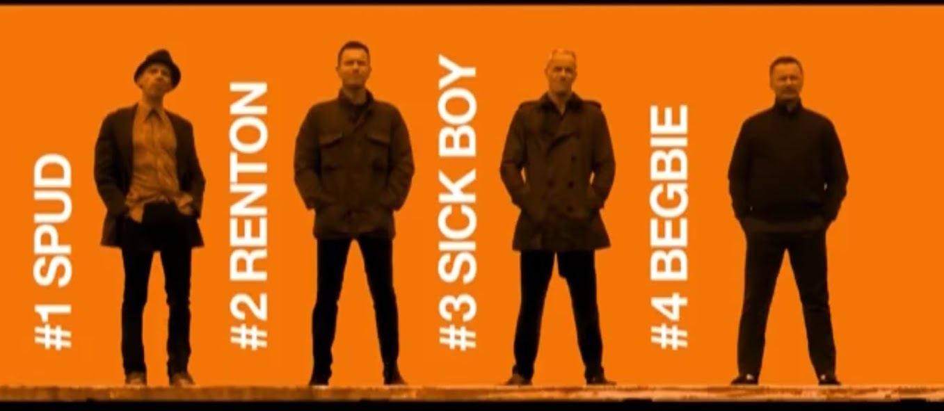 Κοντινό στην οθόνη με διαδοχικά βαγόνια τρένων να περνούν το ένα μετά το άλλο. Μερικές γνώριμες πρώτες νότες μας γυρίζουν 20 χρόνια πίσω. Με το που φεύγει από το κάδρο το τρένο και μπαίνει ο Iggy στο “Lust for Life”, η οθόνη γεμίζει με 4 εξίσου γνώριμες φιγούρες. Από αριστερά προς τα δεξιά: Spud, Renton, Sickboy, Begbie – The Original Cast Returns.