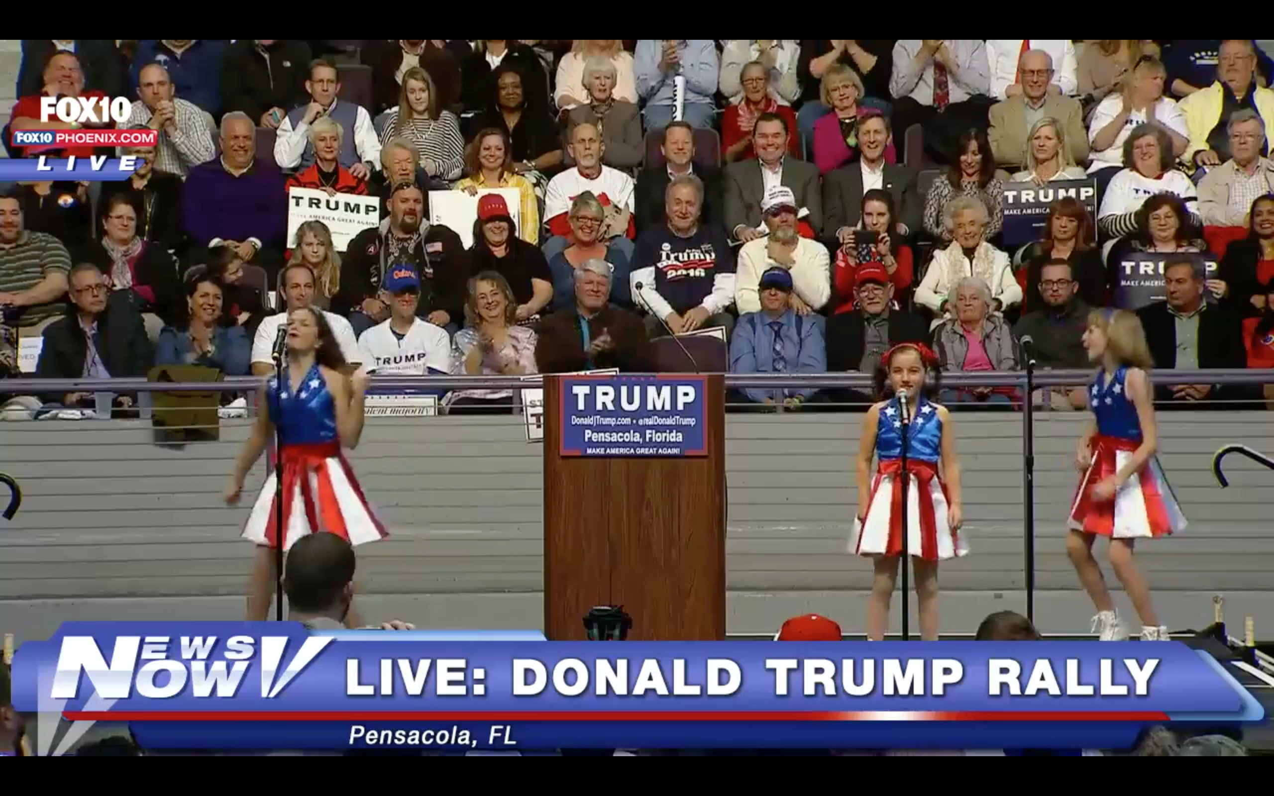 O κατήφορος του Ντόναλντ Τραμπ δεν έχει τέλος. Το βράδυ της Τετάρτης, τρία μικρά κορίτσια, ντυμένα με την «πρέπουσα πατριωτική περιβολή», τραγούδησαν σε προεκλογική εκδήλωση του Τραμπ, υμνώντας την δύναμη της Αμερικής και του υποψηφίου για το χρίσμα του Ρεπουμπλικανικού Κόμματος: «Εχθροί… της ελευθερίας… αντιμετωπίστε τη μουσική… Ο πρόεδρος Ντόναλντ Τραμπ ξέρει πώς… να κάνει μεγάλη την Αμερική», τραγουδούσαν τα «άτυχα» κοριτσάκια.
