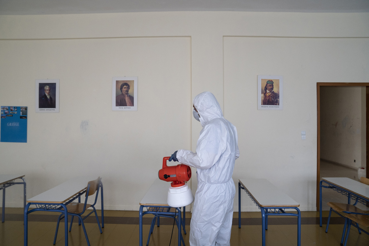 Συνεργείο πραγματοποιεί απολύμανση σε σχολείο, τη Δευτέρα 23 Μαρτίου 2020,στα Ιωάννινα. Σε ισχύ τέθηκε στις 6 το πρωί η εφαρμογή των πρόσθετων αυστηρών μέτρων με απαγόρευση κυκλοφορίας, για τον περιορισμό της διάδοσης του κορονοϊού, που ανακοίνωσε στο μήνυμά του ο πρωθυπουργός Κυριάκος Μητσοτάκης. ΑΠΕ ΜΠΕ/ΑΠΕ ΜΠΕ/ΔΗΜΗΤΡΗΣ ΡΑΠΑΚΟΥΣΗΣ