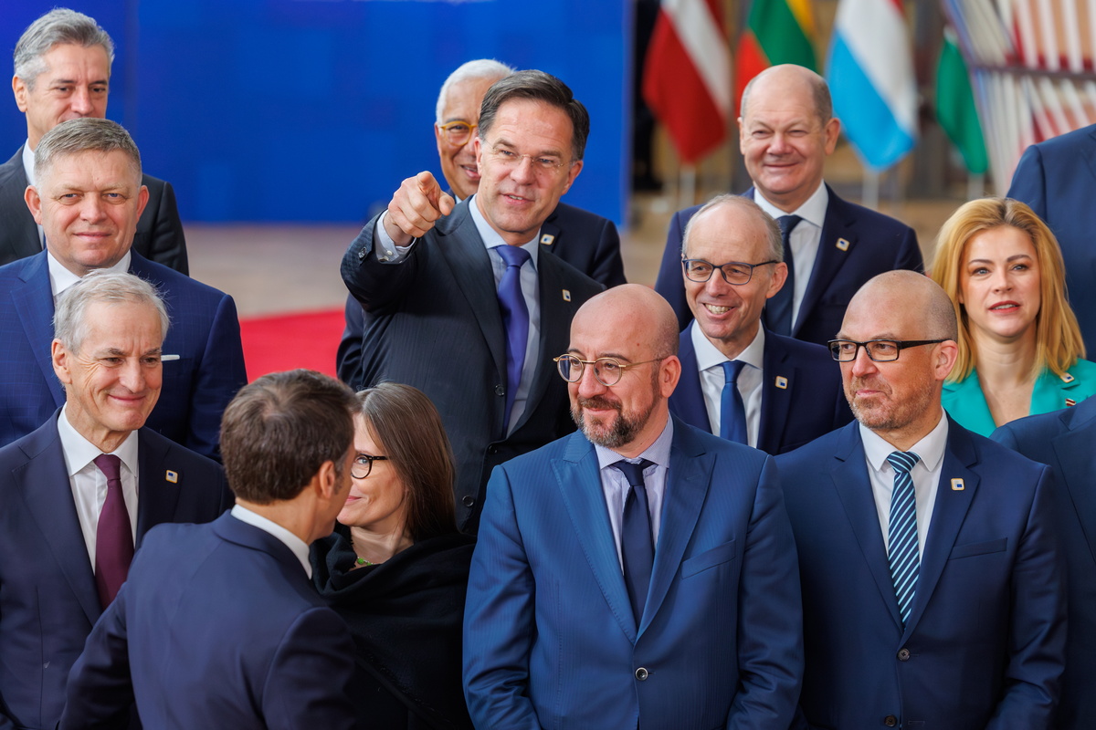 epa11235890 Dutch Prime Minister Mark Rutte (C) reacts as EU leaders arrive to pose for a family picture with their counterparts of the countries in the European Economic Area, Iceland, Norway and Liechtenstein, to mark the 30th anniversary of the European Economic Area (EEA), during the second day of an European Council meeting in Brussels, Belgium, 22 March 2024. EU leaders are meeting in Brussels to discuss continued support for Ukraine, the developing situation in the Middle East, security and defense, enlargement, external relations, migration, agriculture as well as the European semester. EPA/OLIVIER MATTHYS