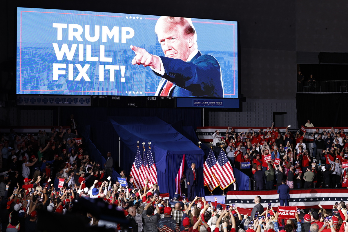 epa11701977 Republican presidential candidate and former US President Donald Trump arrives at a campaign rally in Grand Rapids, Michigan, USA, 04 November 2024. Trump and Vice President and Democratic presidential nominee Kamala Harris are tied in the polls with one day until the election of 05 November. EPA/CJ GUNTHER