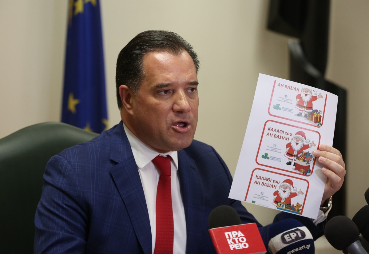 Ï õðïõñãüò ÁíÜðôõîçò êáé Åðåíäýóåùí ¢äùíéò ÃåùñãéÜäçò êñáôÜåé ôï óÞìá ðïõ èá õðÜñ÷åé óôá êáôáóôÞìáôá êáôÜ ôç äéÜñêåéá áíáêïéíþóåùí ãéá ôï åïñôáóôéêü êáëÜèé êáé ôï "ÊáëÜèé ôïõ Áç Âáóßëç", óôï Õðïõñãåßï ôçí ÔåôÜñôç 7 Äåêåìâñßïõ 2022. ÁÐÅ-ÌÐÅ/ÁÐÅ-ÌÐÅ/ ÏÑÅÓÔÇÓ ÐÁÍÁÃÉÙÔÏÕ