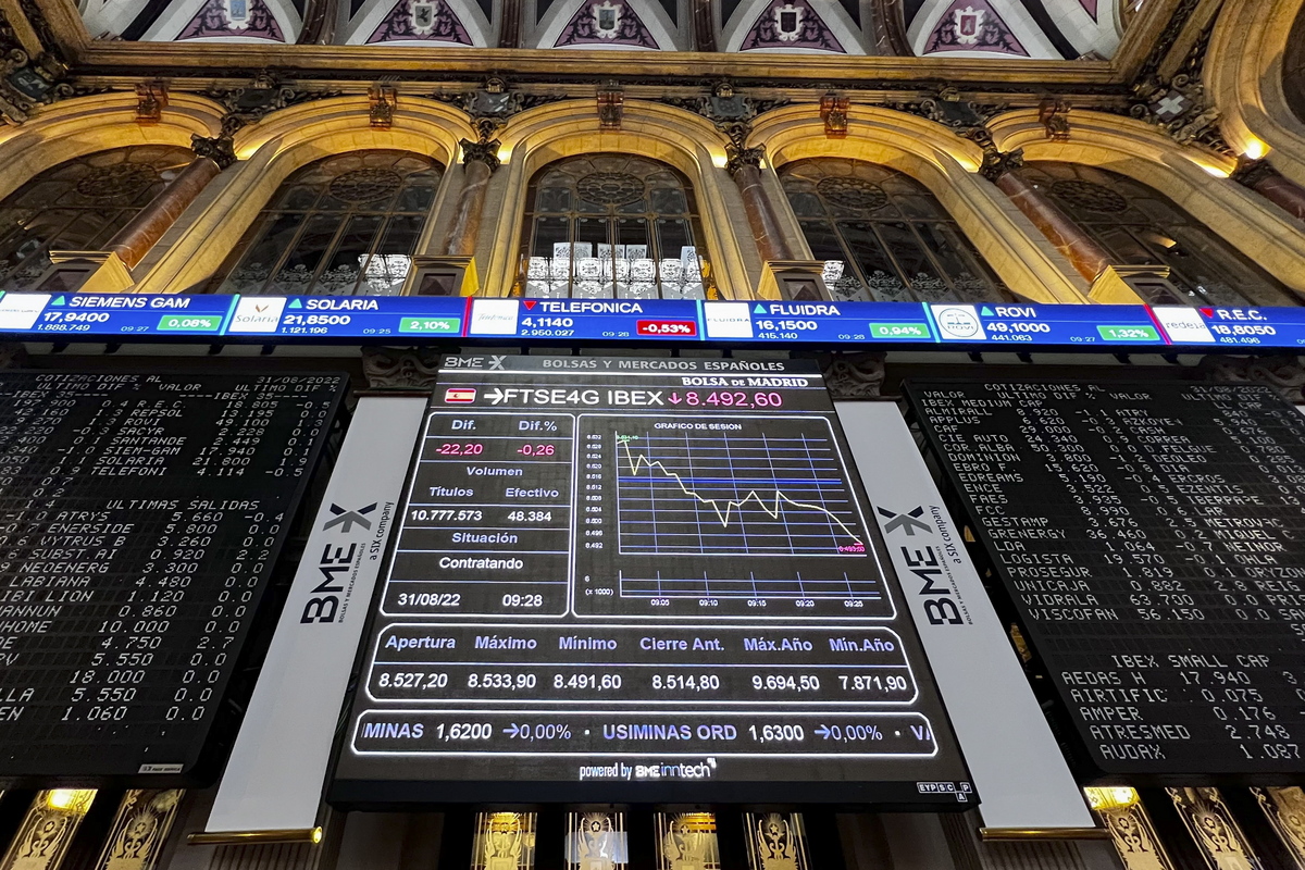 epa10149037 A screen displays a chart with the evolution on index IBEX 35 at Madrid's Stock Exchange Market, Spain, 31 August 2022. The Spanish stock market turns around and falls 0.13 percent. EPA/Altea Tejido