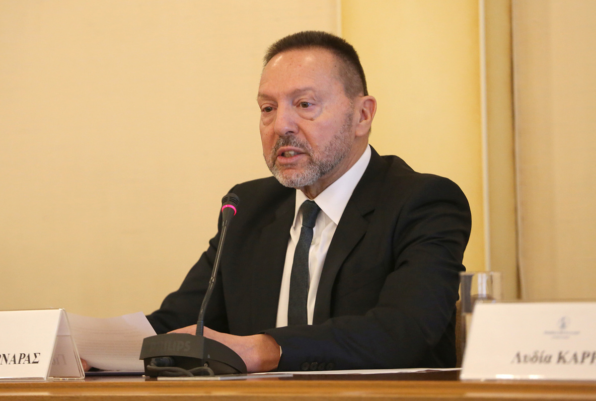 Ο διοικητής της Τράπεζας της Ελλάδος Γιάννης Στουρνάρας μιλά στην παρουσίαση αποτελεσμάτων 2ης Πανελλαδικής Έρευνας για την Προσαρμογή στην Κλιματική Αλλαγή, στο πλαίσιο του οκταετούς ευρωπαϊκού έργου LIFE-IP AdaptInGR: “Ενισχύοντας την εφαρμογή πολιτικής για την προσαρμογή στην κλιματική αλλαγή στην Ελλάδα”, στην Τράπεζα της Ελλάδος, Παρασκευή 31 Μαρτίου 2023. ΑΠΕ-ΜΠΕ/ΑΠΕ-ΜΠΕ/Αλέξανδρος Μπελτές