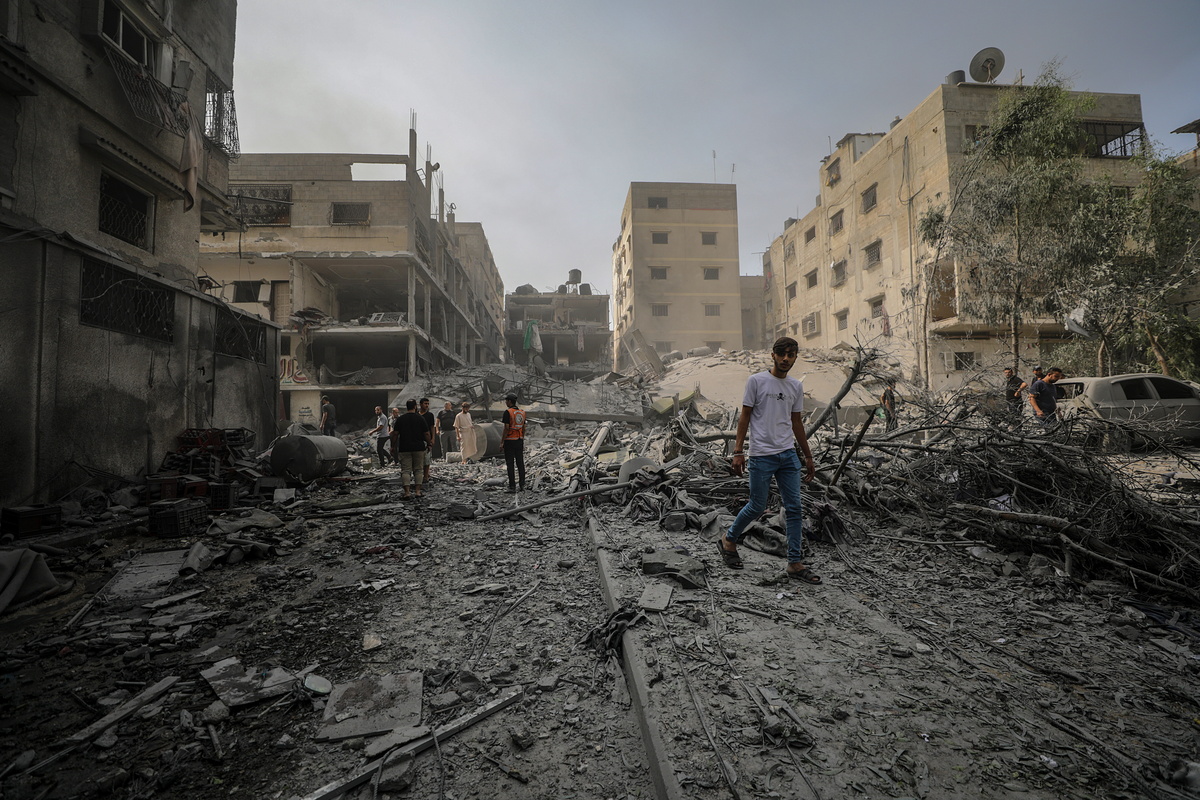 epa10934107 Palestinians inspect a destroyed area after Israeli air strikes in Gaza City, 23 October 2023. More than 4,700 Palestinians and over 1,400 Israelis have been killed, according to the Israel Defense Forces (IDF) and the Palestinian health authority, since Hamas militants launched an attack against Israel from the Gaza Strip on 07 October. EPA/MOHAMMED SABER