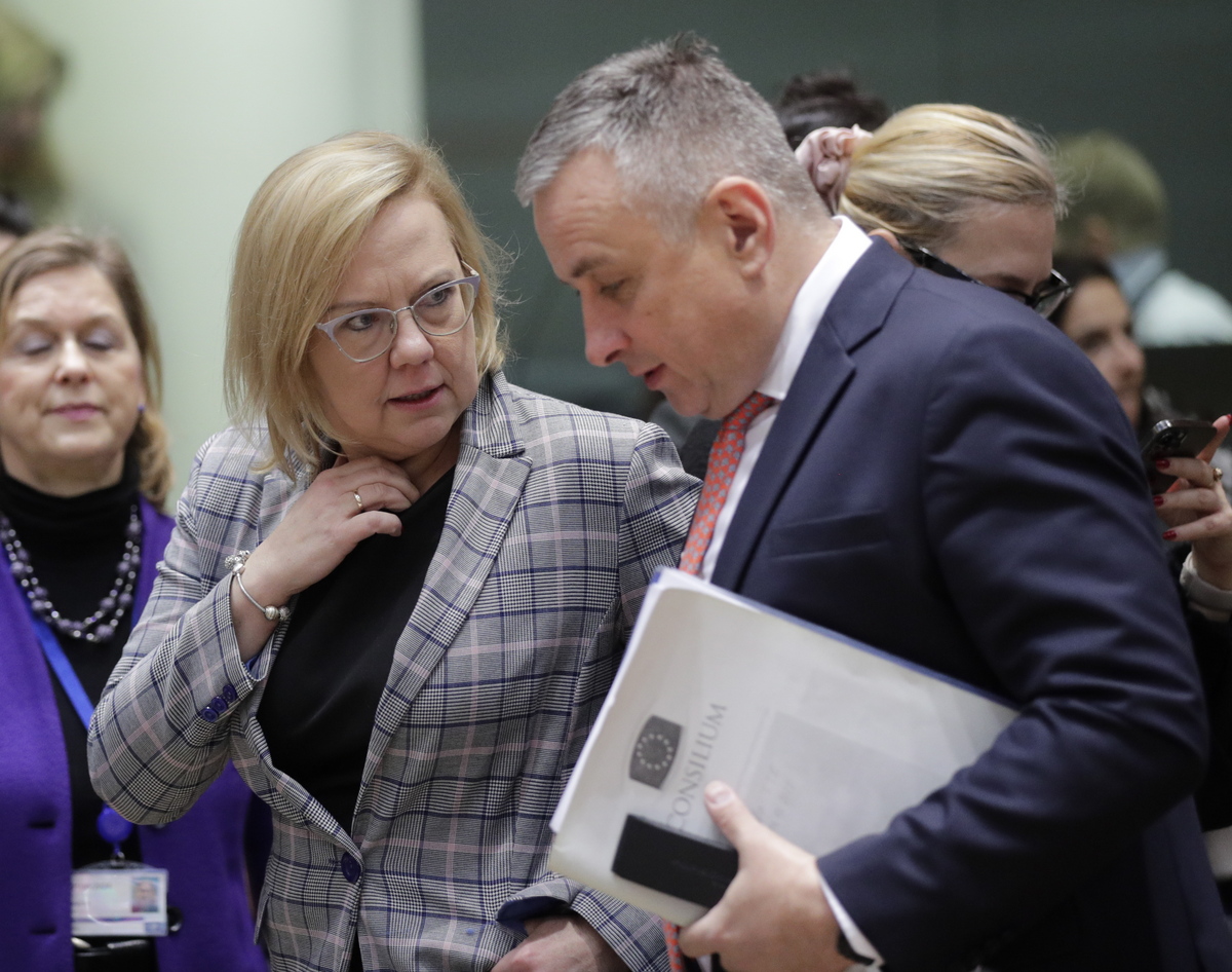 epa10373541 Polish Minister of Climate and Environment Anna Moskwa (L) and Czech Minister for Industry and Trade, Jozef Sikela (R), speak to each other during a Special EU energy council on the energies crisis in Brussels, Belgium, 19 December 2022. EU enegry minister were expected to discuss the development of energy prices and 'the regulation on the internal markets for renewable and natural gases and for hydrogen' as well as to 'seek a general approach on a proposal on methane emissions reduction in the energy sector', according to the EU Council's website. EPA/OLIVIER HOSLET