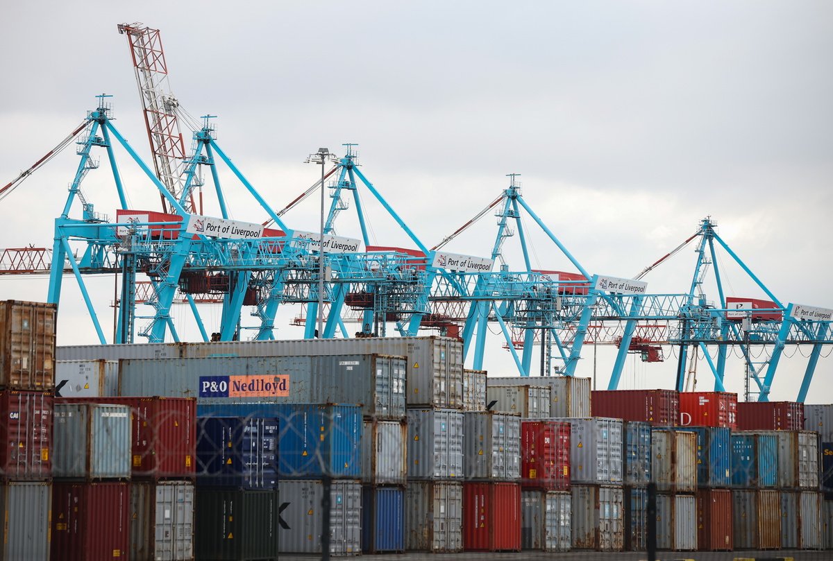 epa11880901 Containers stacked beneath cranes at Seaforth Dock container terminal in Liverpool, Britain, 07 February 2025. US President Donald Trump has imposed 10 percent tariffs on China, with planned tariffs on Mexico and Canada being delayed after last minute talks. The US President has said that tariffs may also be imposed on the EU and the UK, which exports goods and services including energy, cars, machinery and pharmaceuticals to the US. EPA/ADAM VAUGHAN