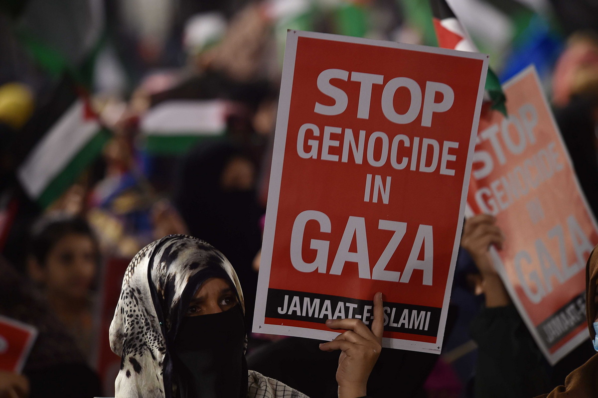 epa11252305 A supporter of the Islamic political party Jamaat-e-Islami (JI) holds a placard during a rally in solidarity with the Palestinian people, in Karachi, Pakistan, 30 March 2024. More than 32,500 Palestinians and over 1,450 Israelis have been killed, according to the Palestinian Health Ministry and the Israel Defense Forces (IDF), since Hamas militants launched an attack against Israel from the Gaza Strip on 07 October 2023, and the Israeli operations in Gaza and the West Bank which followed it. EPA/SHAHZAIB AKBER