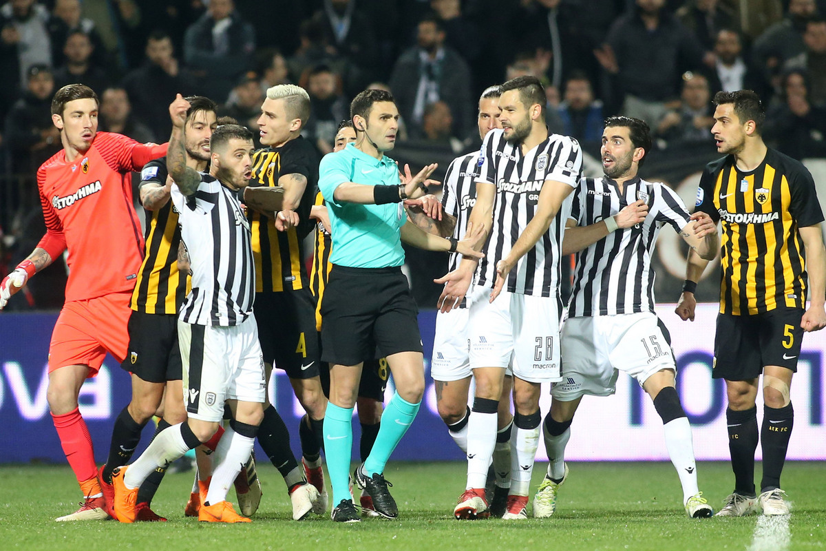 Παίκτες του ΠΑΟΚ και της ΑΕΚ διαμαρτύρονται στους διαιτητές κατά τη διάρκεια του αγώνα ποδοσφαίρου ΠΑΟΚ - ΑΕΚ, για την 25η αγωνιστική του πρωταθλήματος Super League, που διεξήχθη στο γήπεδο Τούμπας, Θεσσαλονίκη, Κυριακή 11 Μαρτίου 2018. ΑΠΕ-ΜΠΕ/ PIXEL/ STR