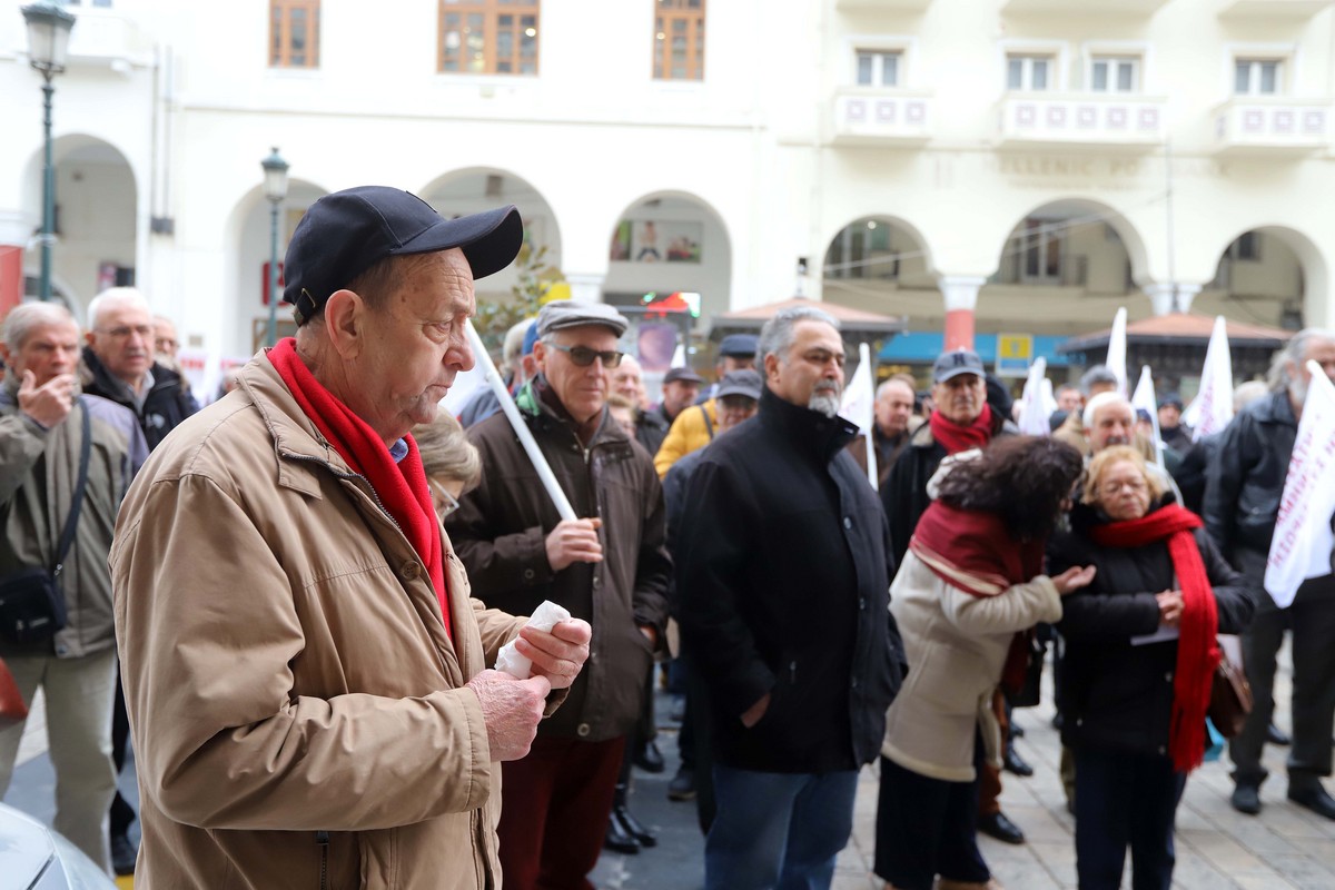 Μέλη συνταξιούχοι της Λαϊκής Ενότητας Α΄ Θεσσαλονίκης κρατούν σημαίες κατά τη διάρκεια συγκέντρωση διαμαρτυρίας, που διοργάνωσε το Σωματείο Συνταξιούχων «Η ΣΥΣΠΕΙΡΩΣΗ» μπροστά στο ΕΦΚΑ (ΙΚΑ) Αριστοτέλους. Θεσσαλονίκη, Πέμπτη 13 Δεκεμβρίου 2018. ΑΠΕ ΜΠΕ/PIXEL/ΜΠΑΡΜΠΑΡΟΥΣΗΣ ΣΩΤΗΡΗΣ