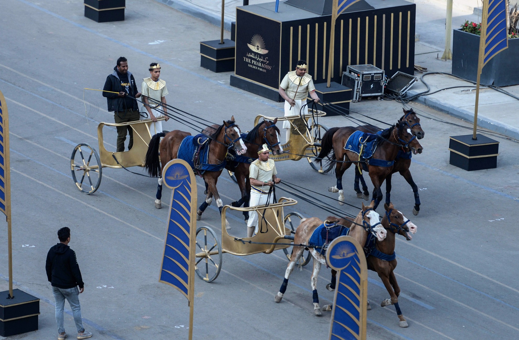 epa09113440 Costumed men ride on horse-drawn Pharaonic War Wheels before a parade to transfer 22 ancient Egyptian royal mummies to the National Museum of Egyptian Civilization, in Cairo, Egypt, 03 April 2021. A convoy will transport 18 ancient Egyptian kings and four queens from the Egyptian Museum in Tahrir Square across the capital city to their new resting place at the National Museum of Egyptian Civilization in Fustat, in what is called The Pharaohs' Golden Parade. EPA/Mohamed Hossam