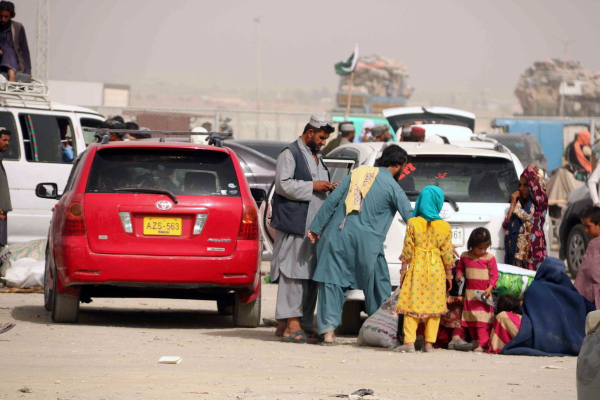 epa09415224 People arrive to go through checking as they prepare to cross into Afghanistan, at Chaman, Pakistan, 15 August 2021. Pakistani authorities reopened the border with Afghanistan on 13 August after several days of its closure. Taliban's shadow governor for Kandahar province had on 05 August issued a statement that announced the closing down of the border with Pakistan at Chaman, and said Islamabad should relax rules for crossing the frontier. EPA/AKHTER GULFAM