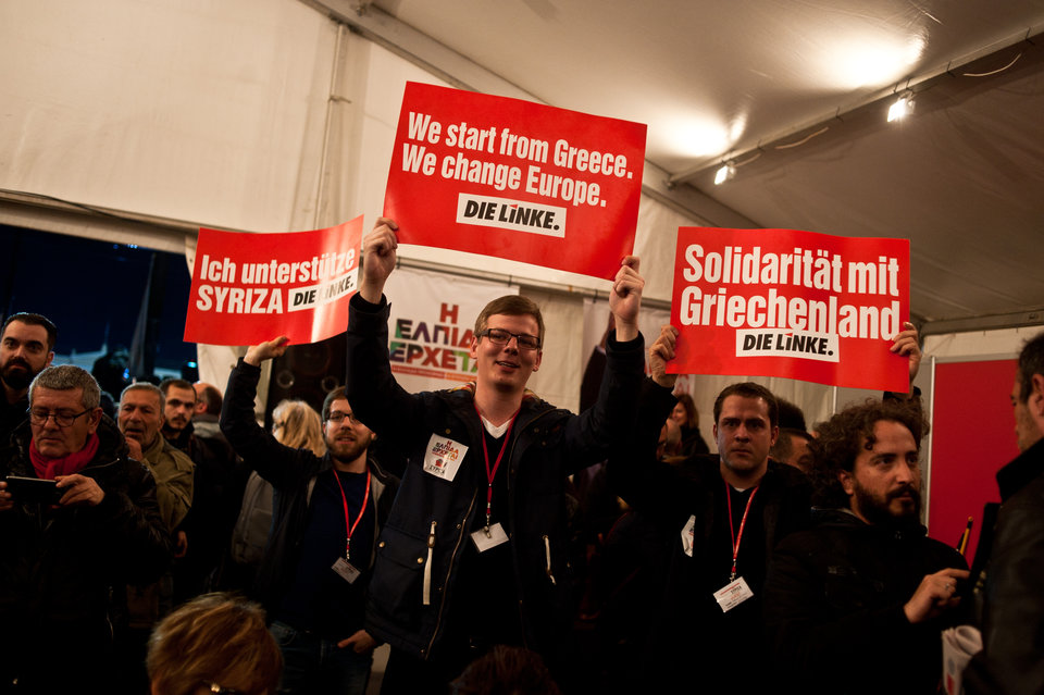 Πανηγυρισμοί των υποστηρικτών του ΣΥΡΙΖΑ στο εκλογικό κέντρο στην πλατεία Κλαυθμώνος. φωτό: Αγγελος Χριστοφιλόπουλος