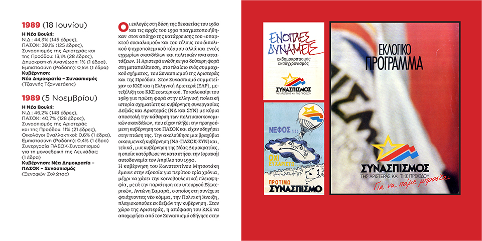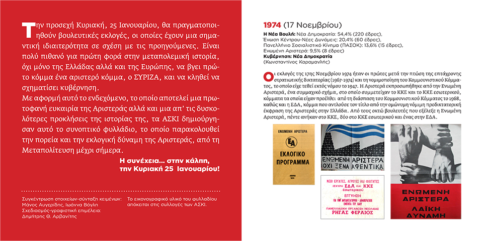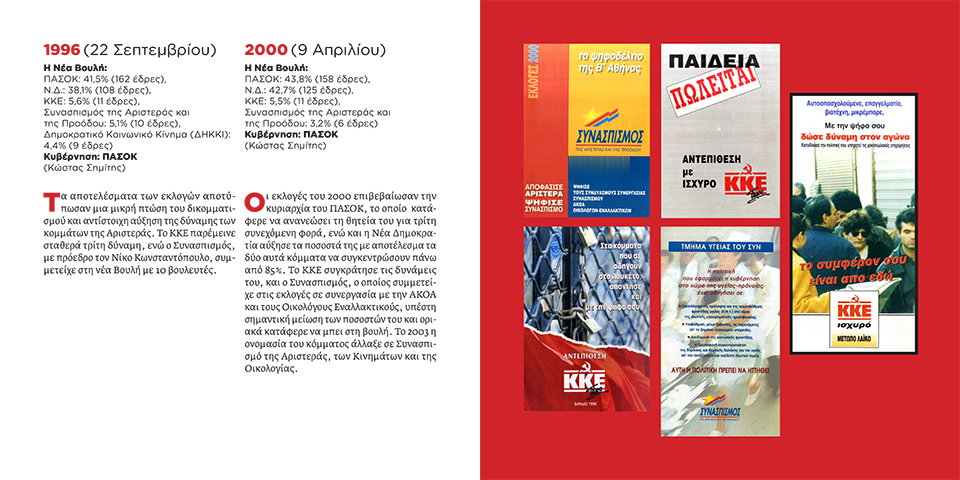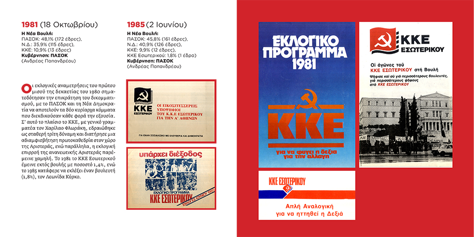 Παρακολουθήστε στο καρουζέλ ακριβώς από κάτω την πορεία των αριστερών κομμάτων στις εκλογές της Μεταπολίτευσης (1975- σήμερα). Τα ποσοστά, οι αφίσες τα συνθήματα αλλά και η περιρρέουσα ατμόσφαιρα σε 9 καρτέλες που ετοίμασε το Αρχείο Σύγχρονης Κοινωνικής Ιστορίας.
