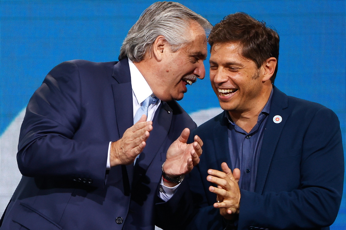 epa09582705 The President of Argentina, Alberto Fernandez (L), and the Governor of the province of Buenos Aires, Axel Kisilof (R), greet supporters after learning the results of the elections, in Buenos Aires, Argentina, 14 November 2021. EPA/Juan Ignacio Roncoroni
