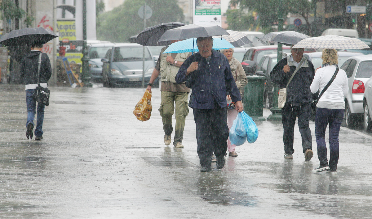 Ðïëßôåò ðåñðáôïýí óôïõò äñüìïõò ôçò ÁèÞíáò ðñïóðáèþíôáò íá ðñïóôáôåõôïýí áðü ôçí äõíáôÞ âñï÷Þ , ÄåõôÝñá 10 Ïêôùâñßïõ 2011. ÁÐÅ-ÌÐÅ/ÁÐÅ-ÌÐÅ/ÁËÅÎÁÍÄÑÏÓ ÂËÁ×ÏÓ