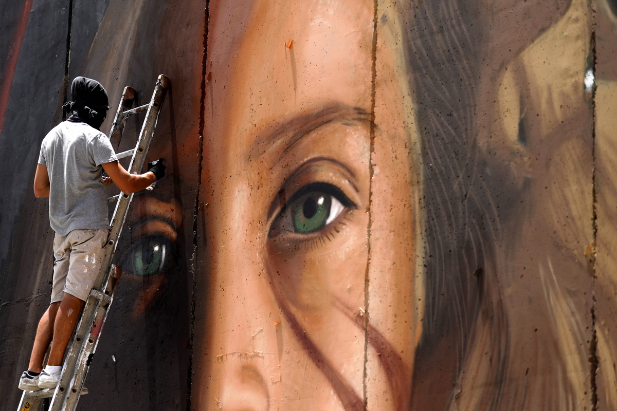 epa06909588 A foreign artist paints a mural of Palestinian Ahed Tamimi on the Israeli separation wall in the West Bank city of Bethlehem, 25 July 2018. Tamimi, 17, is serving an eight-month sentence in Israeli jail and is scheduled to be released on 19 August. Tamimi was arrested on 19 December 2017 by the Israeli army after a video was posted of her slapping Israeli soldiers in the occupied West Bank as they remained impassive. EPA/ABED AL HASHLAMOUN