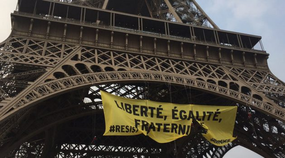 H Greenpeace κρέμασε στον Πύργο του Άιφελ ένα πανό όπου αναγράφονται οι αξίες της Γαλλικής Επανάστασης: «Ελευθερία, Ισότητα, Αδελφοσύνη» και το hashtag #resist. Σαφές πού απευθύνεται.