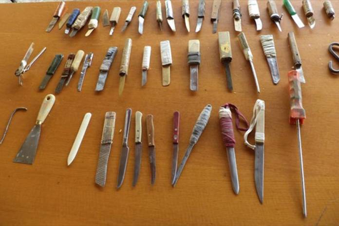 Κατά τον έλεγχο εντοπίστηκαν και κατασχέθηκαν κινητά τηλέφωνα και αυτοσχέδια μαχαίρια.