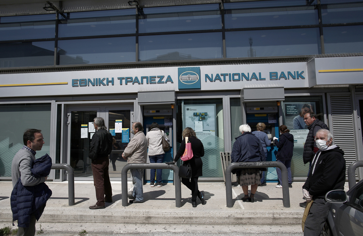 Πολίτες περιμένουν στη σειρά κρατώντας αποστάσεις λόγω κορονοϊού, έξω από κατάστημα τράπεζας, τη Δευτέρα 30 Μαρτίου 2020, στο Μαρκόπουλο. ΑΠΕ-ΜΠΕ/ΑΠΕ-ΜΠΕ/ΓΙΑΝΝΗΣ ΚΟΛΕΣΙΔΗΣ