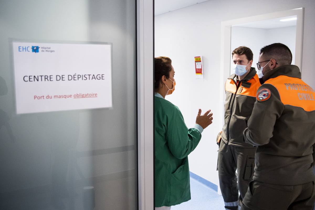 epa08309985 Swiss Civil Protection officials Fabien Schoch (R) and Romain Papaevanghelou (C) wear surgical masks as nurse Catia Oliveira Ferreira (L) shows them around during a media presentation at the Morges Hospital in Morges, Switzerland, 20 March 2020. EPA/JEAN-CHRISTOPHE BOTT / POOL