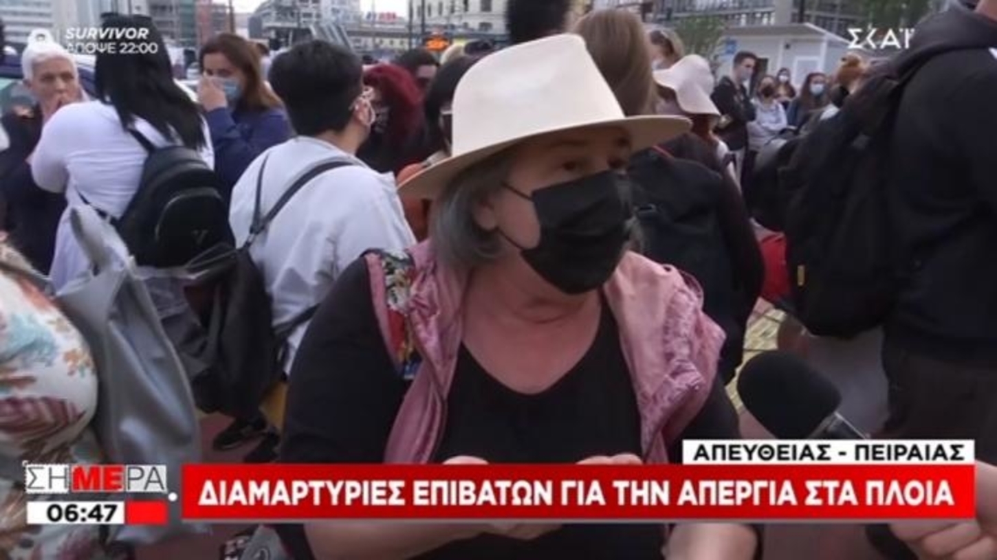 Απαντώντας σε ερωτήσεις δημοσιογράφου του ΣΚΑΙ, που βρέθηκε στο λιμάνι του Πειραιά, μία επιβάτρια τόνισε: «Όχι, δεν είχαμε ενημερωθεί. Είχαμε πάρει τηλέφωνο, γιατί μάθαμε ότι προκηρύχθηκε απεργία στις 16, αλλά οι πλοιοκτήτριες μας λέγανε ότι τα πλοία θα ταξιδέψουν κανονικά. Εμείς δεν τα βάζουμε με τον κόσμο που κάνει απεργία, τα βάζουμε με τους πλοιοκτήτες που δε μας ενημερώνουν. Μέχρι και τελευταία στιγμή μας έλεγαν ότι θα ταξιδέψουν».