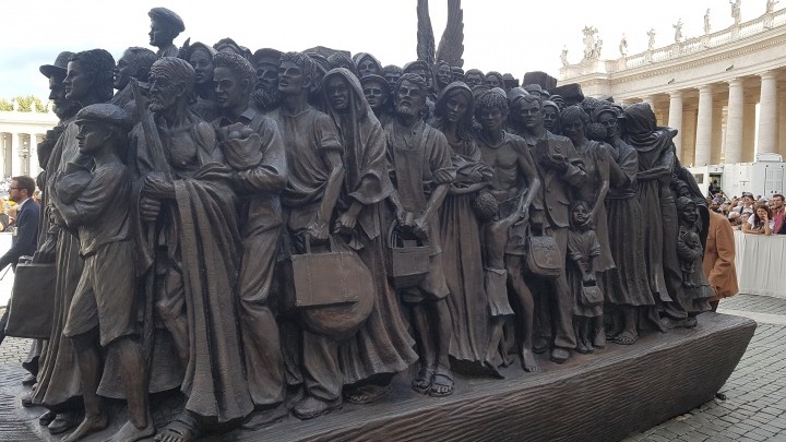 Ένα καινούργιο γλυπτό στην πλατεία του Αγίου Πέτρου στο Βατικανό, στη Ρώμη, τιμά τους μετανάστες και πρόσφυγες όλου του κόσμου. Τα αποκαλυπτήρια του «Angels Unaware (Άγγελοι εν αγνοία τους)» έκανε μετά τη θεία λειτουργία της Κυριακής ο Πάπας Φραγκίσκος στις 29 Σεπτεμβρίου, 105η Παγκόσμια Ημέρα Μεταναστών και Προσφύγων.