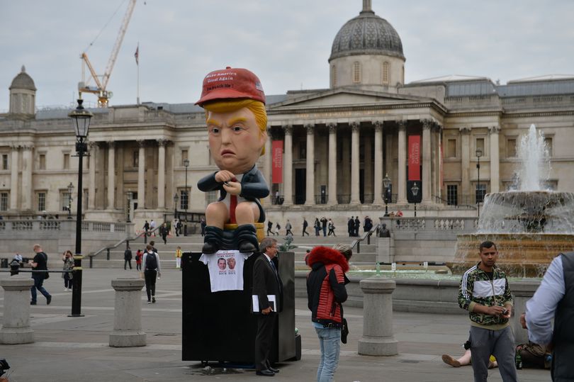 Στο κέντρο της πλατείας Τραφάλγκαρ, οι διαδηλωτές της μεγάλης συγκέντρωσης διαμαρτυρίας κατά της επίσκεψης του Αμερικανού προέδρου τον υποδέχθηκαν με ένα νέο μεγάλων διαστάσεων ομοίωμα ρομπότ που μιλάει. Πρόκειται για μία καρικατούρα που αναπαριστά τον Ντόναλντ Τραμπ καθισμένο σε μία χρυσή τουαλέτα, να φορά ένα κόκκινο καπέλο του μπέιζμπολ.