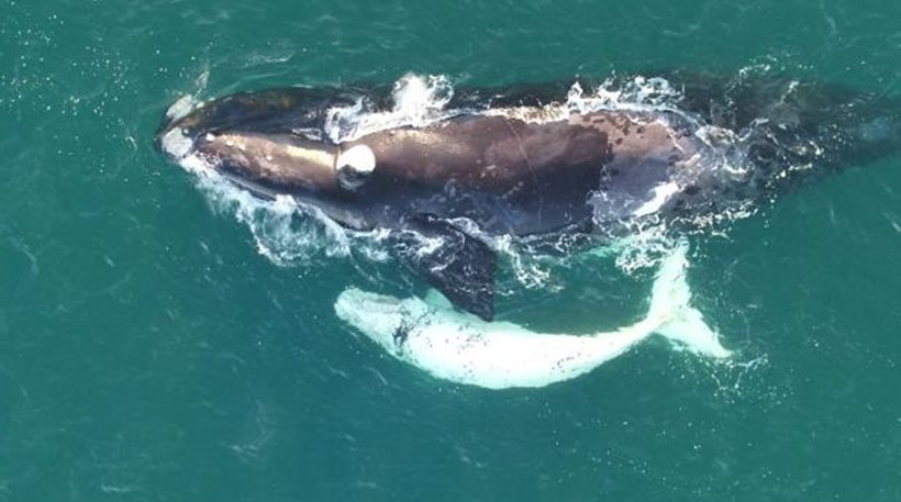 Επιστήμονες κατάφεραν να αιχμαλωτίσουν χάρη σε ένα μικρό τηλεκατευθυνόμενο αεροσκάφος (drone) εικόνες μιας μαύρης φάλαινας της Αυστραλίας που κολυμπούσε ανοιχτά των ακτών της χώρας έχοντας δίπλα της το μικρό της, ένα φαλαινάκι κατάλευκο, κάτι που συμβαίνει πολύ σπάνια.