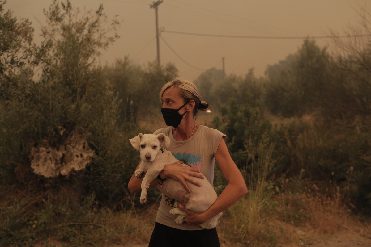 Γυναίκα κρατά σκύλο που διέσωσε κατά τη διάρκεια της πυρκαγιάς στην περιοχή Πευκί στη Βόρεια Εύβοια, Κυριακή 08 Αυγούστου 2021. Ένα τεράστιο μέτωπο της φωτιάς κατευθύνεται αυτή την ώρα στην Γαλατσώνα και βρίσκεται σε απόσταση αναπνοής από το χωριό. Ένα άλλο πύρινο μέτωπο πλησιάζει τις Γούβες σε μία πορεία που οδηγεί στο Αρτεμίσιο, το Πευκί και τη θάλασσα. Λίγο μακρύτερα και από την άλλη πλευρά του νησιού, η φωτιά κινείται κατευθείαν προς τους Καματριάδες και τους Γαλατσάδες - και αν περάσει από αυτά τα δύο κομβικά σημεία, πλέον θα βρεθεί πάνω από την Αιδηψό. Στο νότιο τμήμα, οι υποστηρικτικές ομάδες πυροπροστασίας που έχουν φτάσει στη χώρα μας από την Ουκρανία και την Ρουμανία και εργάζονται νυχθημερόν, ελέγχουν την κατάσταση στο χωριό Τρούπι, όσο και λίγο πιο βόρεια, στα Καλύβια και στο Σπαθάρι. ΑΠΕ-ΜΠΕ/ΑΠΕ-ΜΠΕ/ΚΩΣΤΑΣ ΤΣΙΡΩΝΗΣ