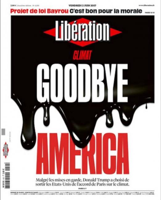 Στο ίδιο μοτίβο συνεχίζει και η γαλλική Liberation. Στο εξώφυλλό της τρέχει πετρέλαιο, ενώ γράφει ένα απλό «Αντίο Αμερική».