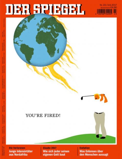 Το γερμανικό Der Spiegel φιλοξενεί στο εξώφυλλό του ένα σκίτσο του αμερικανού προέδρου που συνδυάζει τις δυο αγαπημένες του ασχολίες. Το γκολφ και τις απολύσεις. Αυτή τη φορά θύμα του είναι η Γη.