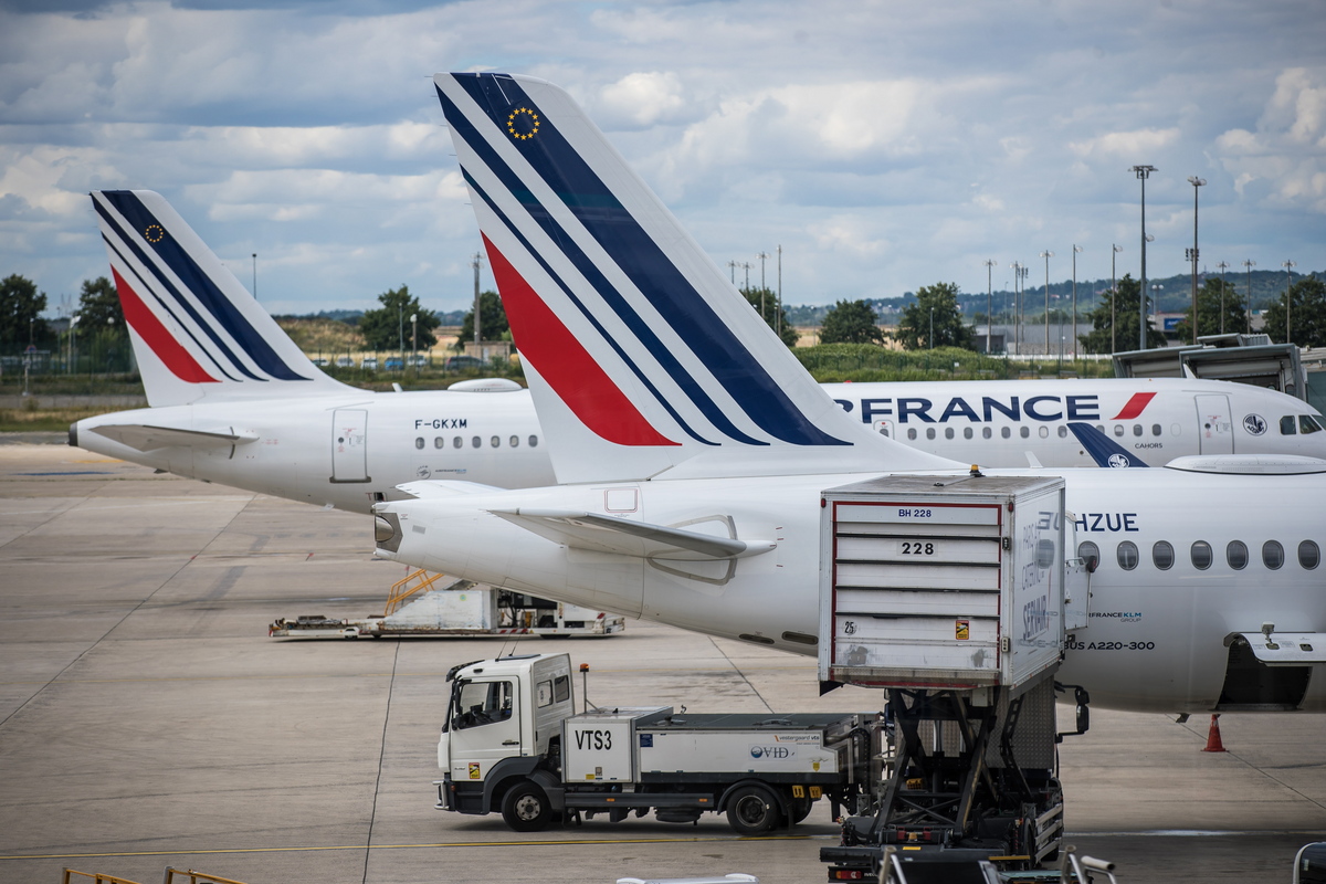 epa10046240 Air France aircrafts are parked at Roissy Airport outside Paris, France, 01 July 2022. Unions representing Air France and airport workers have called for a strike. EPA/CHRISTOPHE PETIT TESSON