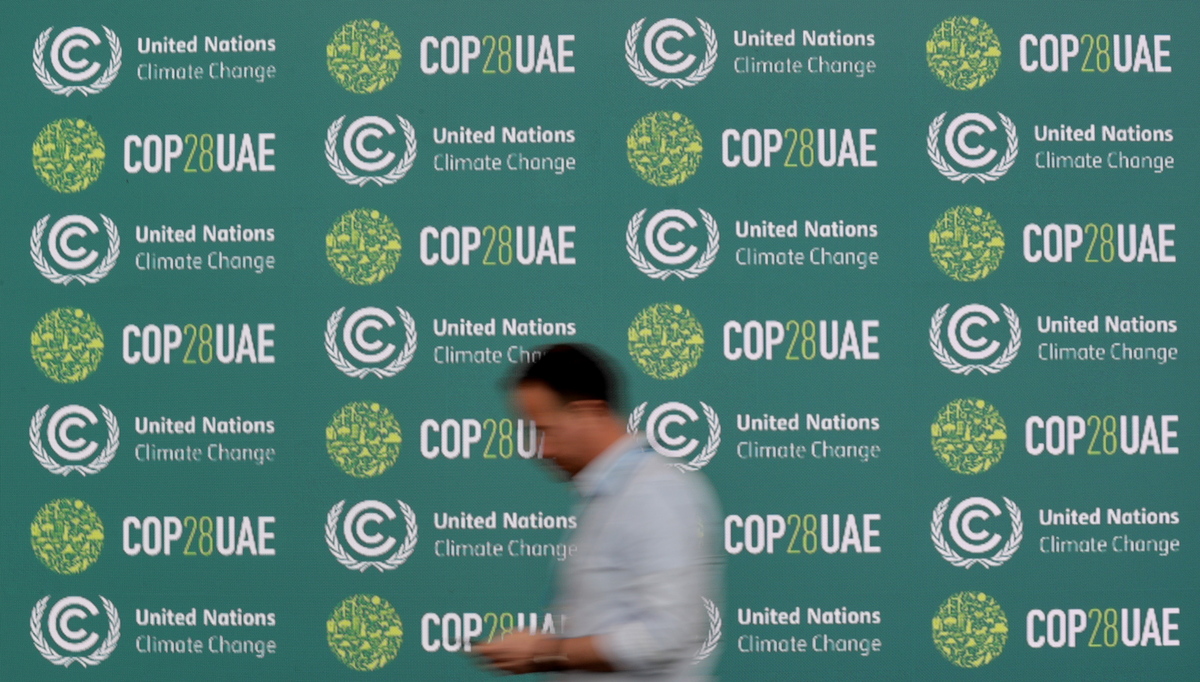 epa10676082 A participant walks past the official United Arab Emirates COP28 stand during the Climate Change Conference in Bonn, Germany, 06 June 2023. The SB58 Climate Change Conference in Bonn, is the pre-sessional meeting for the COP28 Climate Change Conference to hold in Dubai in December and runs until 15 June. EPA/FRIEDEMANN VOGEL