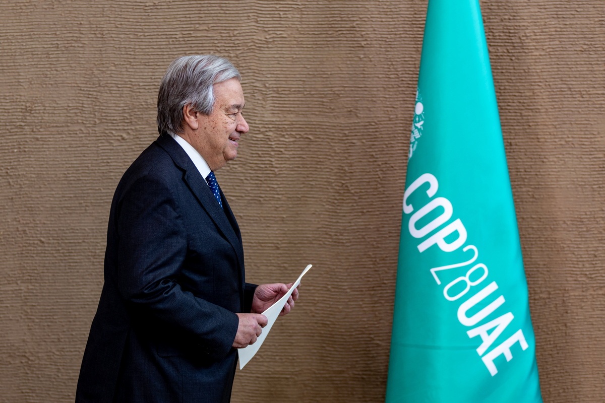 epa11022458 United Nations Secretary-General, Antonio Guterres, arrives to give a statement during the 2023 United Nations Climate Change Conference (COP28), in Dubai, United Arab Emirates, 11 December 2023. COP28 runs from 30 November to 12 December, and is expected to host one of the largest number of participants in the annual global climate conference as over 70,000 estimated attendees, including the member states of the UN Framework Convention on Climate Change (UNFCCC), business leaders, young people, climate scientists, Indigenous Peoples and other relevant stakeholders will attend. EPA/MARTIN DIVISEK