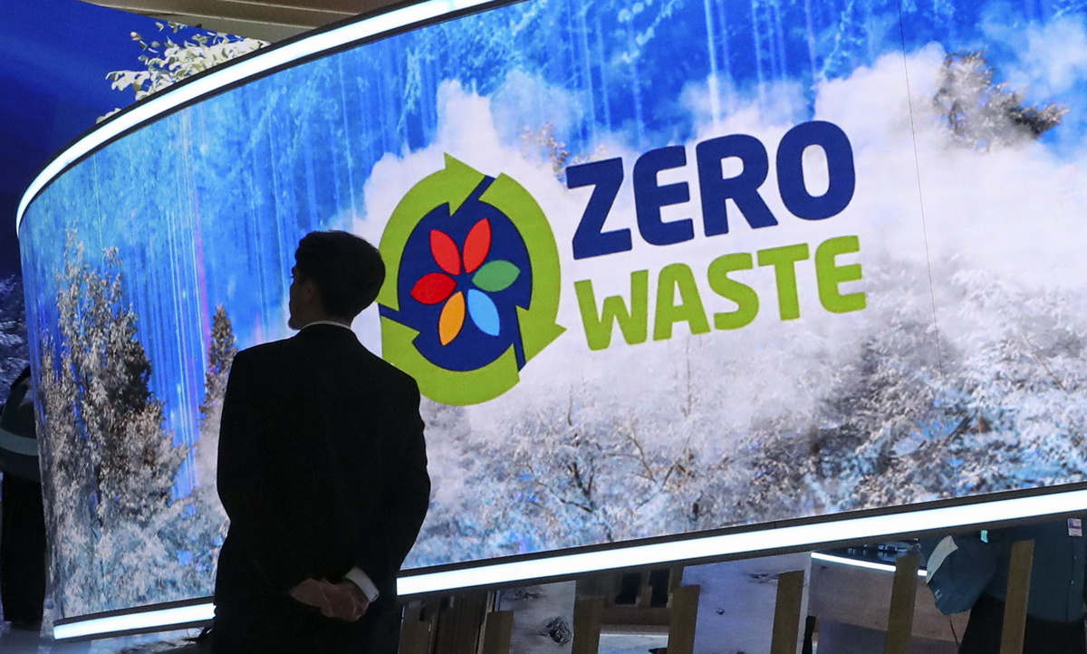 epa11718704 A visitor stands near Zero Waste foundation pavilion at the UN Climate Change Conference COP29 in Baku, Azerbaijan, 13 November 2024. The Azerbaijani capital of Baku hosts the 2024 United Nations Climate Change Conference (COP29) from 11 to 22 November 2024. EPA/IGOR KOVALENKO