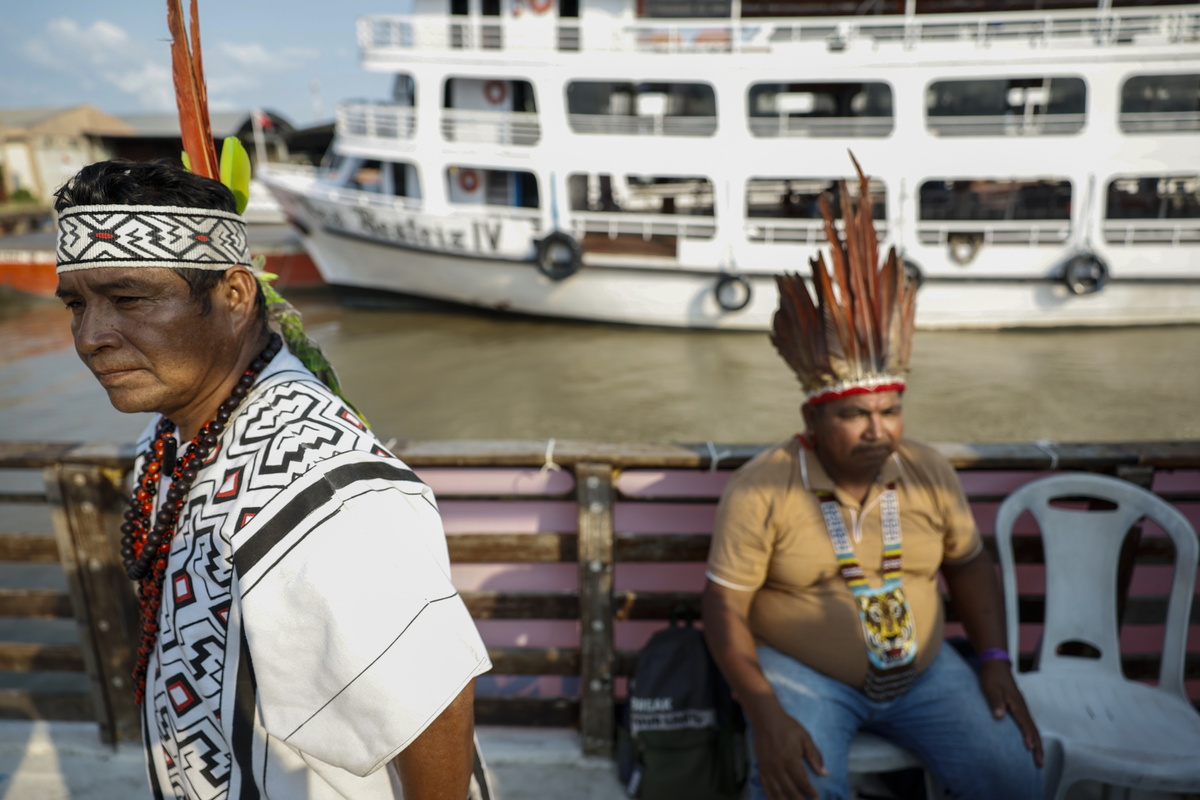 epaselect epa12515241 Indigenous people onboard the Yaku Mama Amazon Flotilla after its arrival in the port city of Belem, Brazil, 09 November 2025. The flotilla is an Indigenous-led expedition that traveled down the Amazon River to Belem to demand climate justice during the COP30 climate summit. The city will host the 30th United Nations Climate Change Conference, COP30, from 10 to 21 November. EPA/ANTONIO LACERDA