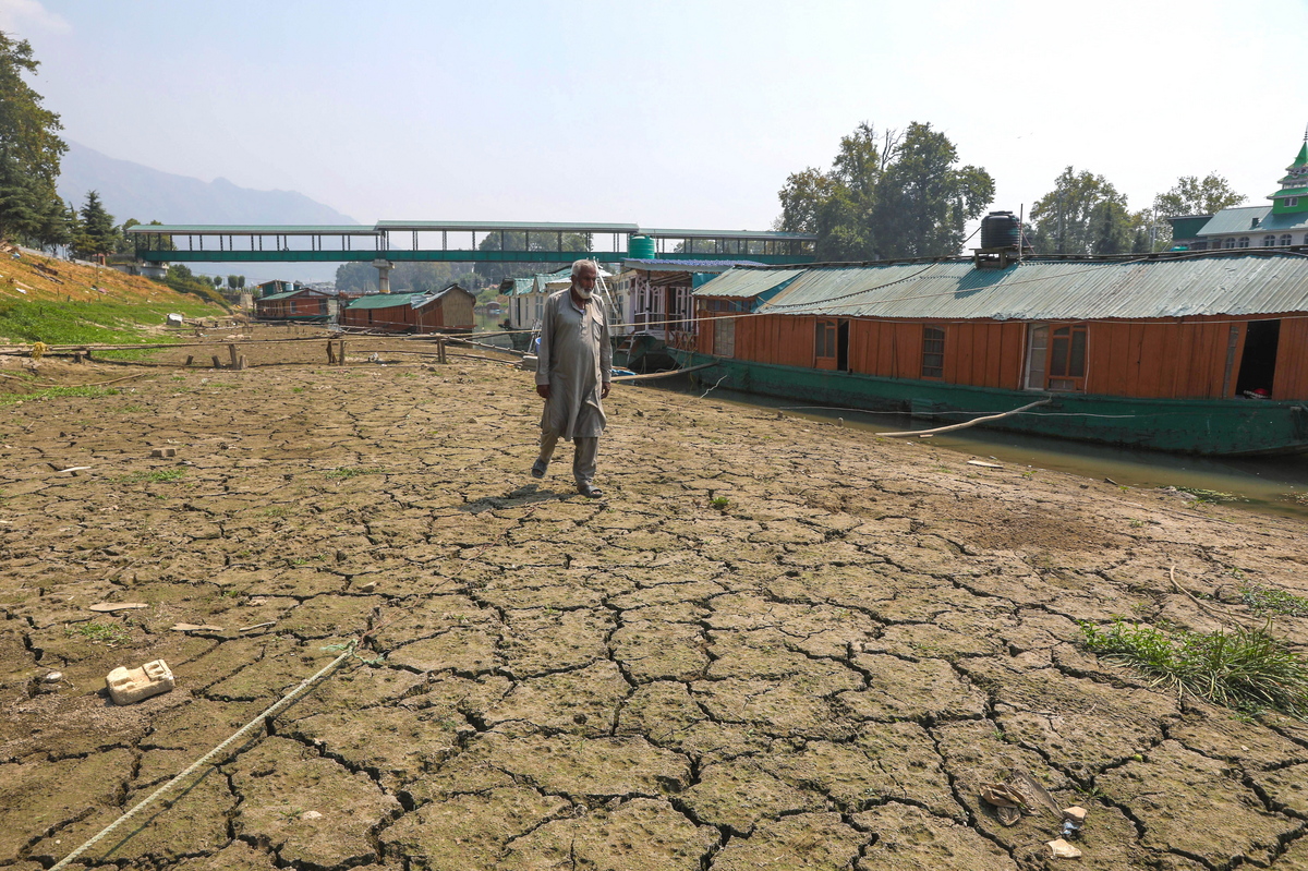 epa10856106 A man walks over the dried up patches on the banks of River Jhelum in Srinagar, the summer capital of Indian Kashmir, 12 September 2023. The water level in the River Jhelum has recorded a significant drop due to deficit rainfall in Kashmir. The local Meteorological Department has forecasted dry and hot weather till 18 September and there is no possibility of rainfall in the region. EPA/FAROOQ KHAN