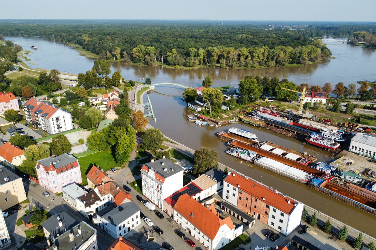 epa11614192 A photo taken with a drone showing the Odra River in Nowa Sol town in the Lubusz Voivodeship, Poland, 19 September 2024. Nowa Sol is preparing for the passage of the culminating wave. Since 13 September, regions of Central and Eastern Europe have been severely affected by devastating floods caused by Storm Boris. On 16 September, the Polish government officially declared a state of natural disaster on the affected areas. EPA/Lech Muszynski POLAND OUT