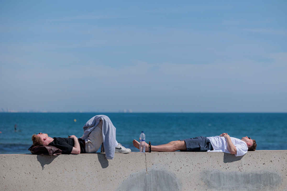 epa10604217 People enjoy the sun near of La Malvarrosa beach in Valencia, eastern Spain, 02 May 2023. Temperature is to reach 23 Celsius degrees in the city. EPA/BIEL ALINO