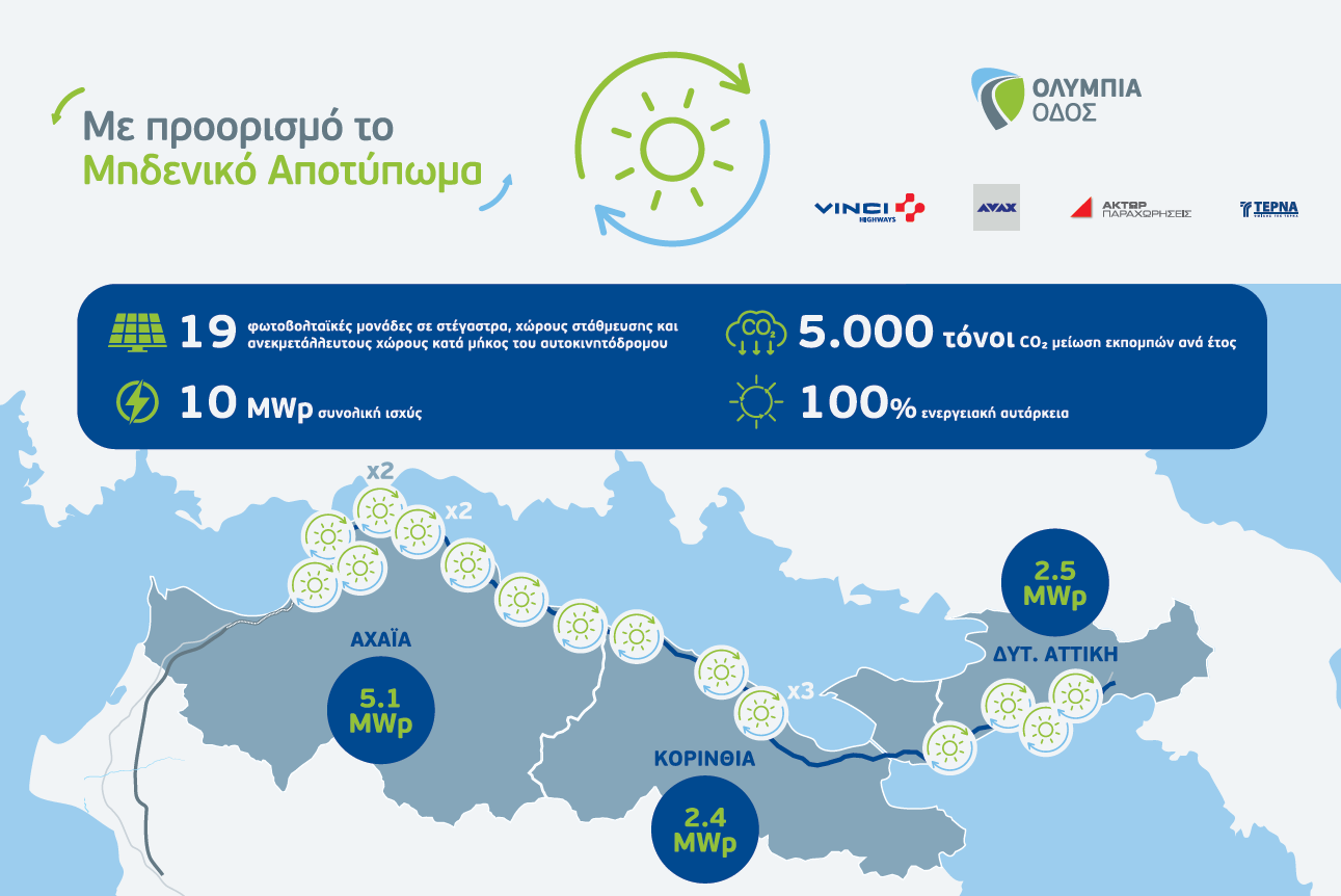 Ο Διευθύνων Σύμβουλος της Ολυμπίας Οδού, Δρ. Παναγιώτης Παπανικόλας, επεσήμανε ότι: «Στην Ολυμπία Οδό δεν περιοριζόμαστε στην κατασκευή δρόμων –εργαζόμαστε για να διαμορφώσουμε ένα βιώσιμο αύριο. Ένα από τα πιο ουσιαστικά μας βήματα προς αυτή την κατεύθυνση είναι ο μηδενισμός του ανθρακικού αποτυπώματος έως το 2030. Με 19 φωτοβολταϊκές μονάδες συνολικής ισχύος 10 MWp εγκατεστημένες κατά μήκος του αυτοκινητοδρόμου, καλύπτουμε σήμερα πλήρως τις ενεργειακές ανάγκες των υποδομών μας με ρεύμα από ΑΠΕ. Αυτό είναι ένα κρίσιμο μέρος του σχεδίου μας για πλήρη απαλλαγή από τις εκπομπές αερίων έως το 2030».